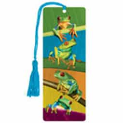 How realistic can you get? This Three Dimensional Book Marker depicts colorful Tree Frogs , each on a separate limb, with a baby frog at its side. You virtually feel you can reach out and touch each one–Outstanding Effect– Comes with green silk tassel to help mark page. Get your Rock’n 3D frog book marker today !