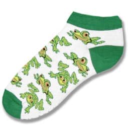Kids can’t have all the fun. Here we have Adult Size Treefrog Ankle Socks for the kid in all of us! Against a white background, little green treefrogs are depicted in several fun poses…….So Enjoy folks and be as funky as you want!! Size: Sock size: 6-11