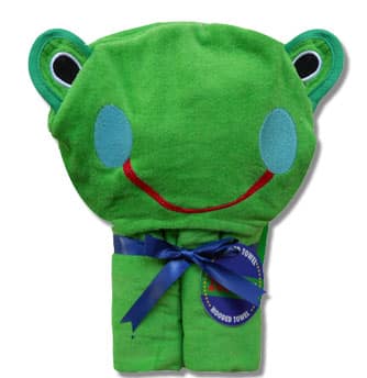 Wrap up your child after his bath with this luxurious Frog Hooded Towel. He will be delighted with the softness and coziness that this wide grinned froggie provides. Attractively wrapped up with a lovely blue ribbon, it is ideal for gift giving.