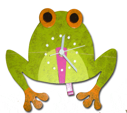 All handcrafted, this colorful, artfully designed froggy clock will grace your wall and bring a smile to your face, no matter what time it is. It comes in vivid colors of medium green, yellow, orange and purple. The pendulum is actually the frog’s tongue with a little curl at the base…very clever idea. It’s a real conversation piece as well as a decorative, functional , frog lovers delight.