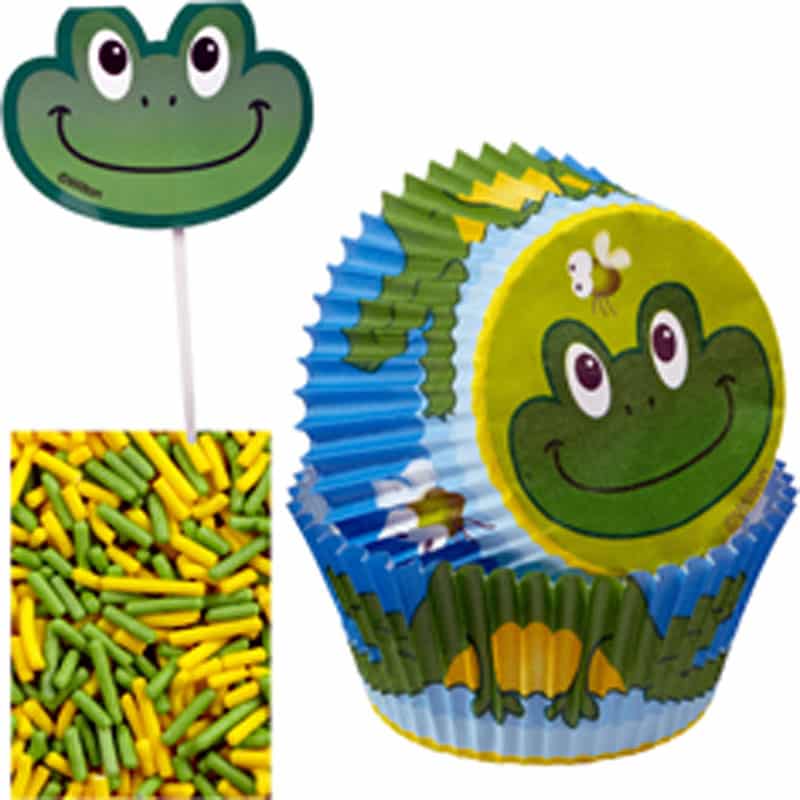 - This package contains twenty-four 2″ cups in 1 design, twenty-four 3″ picks with a frog head on each and 1 bag of sprinkles