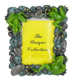 This unique Frog Picture Frame is designed with two elements: frogs and river rock…a perfect, unusual, and interesting blend. The dark, natural colored river rock, surrounds the entire edge of this beautiful frame, in several layers. Three lovely green, vibrantly glazed ceramic frogs adorn three corners of the frame, resting on the equally shiny finish river rock. What a perfect setting for your treasured photograph!!!
