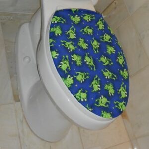 It’s our Frolicking Frog Toilet Seat Cover. Present it to the man who has everything! Bound to bring a few good belly laughs to the “Over the Hill” Birthday Boy (or girl).Now he can have his own vibrantly colored green frogs on a royal blue background, adorn his toilet seat lid.