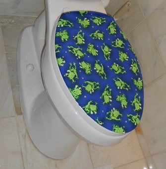 It’s our Frolicking Frog Toilet Seat Cover. Present it to the man who has everything! Bound to bring a few good belly laughs to the “Over the Hill” Birthday Boy (or girl).Now he can have his own vibrantly colored green frogs on a royal blue background, adorn his toilet seat lid.