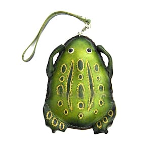 Handsome and Functional is this unique hand crafted frog coin purse. This attractive purse goes through an intricate process to assure its quality: The leather is dyed a dark green with the center area rubbed to remove some of the dye making it a lighter green. The beige colored accents are created by carving out the top layers of leather. The frog’s legs are crafted from hardened and shaped pieces of leather. The purse is designed with a leather wrist strap for easy carrying, a sturdy lobster claw closure is attached to a ring at the frog’s nose, and a zipper is located along the bottom edge of the frog. It has two beaded pop up eyes and is large enough to store credit cards, a lipstick , as well as spare change etc.