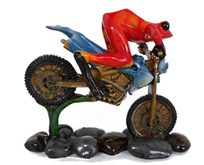 This is what you’ve been waiting for–a Biker Frog! Here he is, “Motorcycle Frankie”, posing on his decked-out brightly colored bike. After the picture, he’s ready to zoom off with his gang and head for parts unknown. The greatest gift you can give a biker!