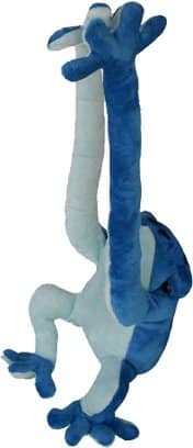 This authentically colored, bright – blue Poison Dart Frog is made of ultra soft plush. NOW FOR A GREAT SURPRISE! – – He Hangs on You. His elongated two front legs are equipped with a Velcro locking device. You can place the legs around your neck, press the Velcro lining together and your Poison Dart Frog sits comfortably on your chest, like a frog papoose — How COOL is That?