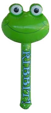 A very large green inflatable Bopper, with a happy frog face is yours for the FUN of it! You can shake the handel, which has “Ribbit’ painted on both sides in blue, and a squeaky sound accompanies the whimsical frog face as it bops up and down. Great for sporting events, party favors or pool parties.(not meant to be used as flotation device)