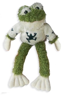 Wearing a “Frog Motif” (what else) white knit sweater, “Scraggs” our froggy cheerleader boy is ready to lead the cheer. He is one snappy dude. He is crafted of super-soft, extra-snuggly Chenille Plush material. Another nice feature about “Scraggs” is that he is custom made for us…can’t be found in any catalogue. His bright shiny eyes beckon you to take him home…sit him on a shelf. or just let him hang out with you as your buddy.