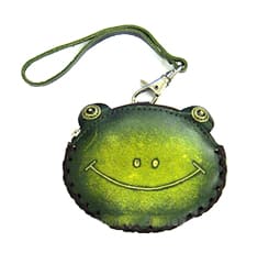 This little coin purse is hand tooled in leather with a special process: The leather is dyed a dark green with the center area rubbed to remove some of the dye resulting in a lighter green.The eyes and mouth are created by carving out the top layers of leather to reveal the natural beige color underneath. A happy little frog is etched on the back side of the purse. The zipper is located along the top of the frog’s head. A leather wrist strap with a lobster claw closure is attached to a ring at the top. There is also a split ring for attaching keys. A very handy happy little fellow.
