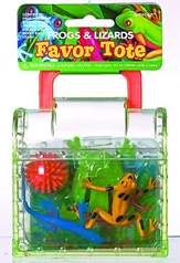 Plastic carrying tote with fun filled frog items. Contains:Sticker shape, frog pencil top, jumping frog, wooly ball and sticker sheet.